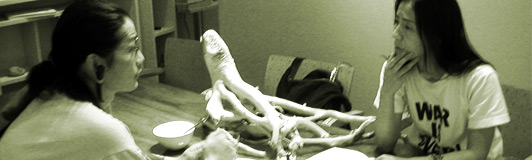 C:2002年〜2003年の年末年始に、沖縄のヌチシヌジっていう洞窟へ行ったのは、ほんと特別な体験だった。本当に真っ暗な中でろうそくを一本灯して一晩過ごしたのね。体内回帰じゃないけど、戻った感じ。そこでは自分の状態で全てが変わっていく。気温の変化に寒気を感じることもできるし、神秘を感じることもできる。全てが自分の意識次第。これ以上ないくらい音にリラックスできることもあれば、これ以上ないくらいうるさく攻撃を受けてるように感じることもできる。そういう自由を∀KIKOさんも森の住人たちに感じたりすることができる。2人が改めて一緒にやる意味があるのは、展示っていうよりもそういう世界を作ることなのかなって思う。